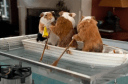 – – Kia’s hamsters rock, and Geico’s guinea pigs row…at least they do in the newest Geico commercial!  Faced with skyrocketing electric bills (…yes, I  feel your pain!), we are introduced to one ingenious gentleman who has created a hydroelectric generation facility where a trio of hamsters row a tiny boat in an aquarium, producing enough juice for him to surf the net all day!  Not that it was any easy task, mind you…it took six months to train two hamsters to row, and fully eight months to get the “little chubby one” to yell “row!”