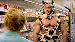 Now I hope that they pay these guys well…I really do! The bodybuilder cow shuffles out and asks a female shopper if she’s “looking for quality meat.” Surprised, she looks up, beholds the manly cow, and gasps, “Ahh…I think I found it!”