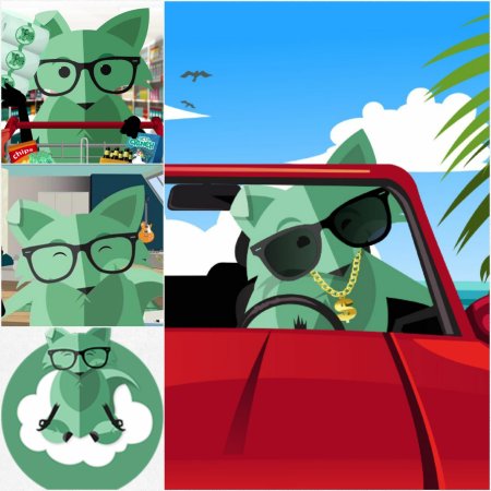 Who’s green and keen? — The Mintmobile Fox, of course! Now normally when foxes turn green, it’s not a good thing, of course, and may signify severe gastrointestinal distress. It all right for this little guy, however, ’cause he’s just a ‘toon, but one who we can see appearing in a wide variety of settings, beginning with his bed and ranging to such diverse environments as a supermarket and gymnasium. This fox meditates…he rides in cars conversing with women…and looks ever so cool motoring in his own sweet ride. He’s an inspiration to all of us of the vulpine persuasion…