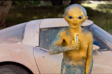 In the frenetic ad, a yellow and blue alien (Butterfinger colors) escapes from a lab, helps himself to a dusty Corvette, and goes on a thrill ride with a hitchhiker he picks up who happens to be selling alien T-shirts! The wild ride ends with the alien using his telekinetic powers to help himself to a Butterfinger bar, after which he proclaims the revised slogan.