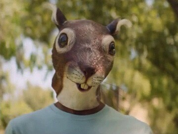 …It’s then that the commercial takes a surreal turn, for towering above the sea of squirrels is a creepy man-squirrel, wearing a squirrel mask that covers his entire head. He, too, is seeking a hand-out, and even making beseeching squirrel-noises. Is this a peanut butter pervert? And what should the young lady do? Mace him, scream for help, or try to bean him with the peanut butter jar? This question is left unanswered, but some people will go to any lengths for the product. It’s that Jif’ing good, we’re told. I do sympathize, honestly, sharing the addiction…