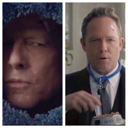 Dean Winters is back as the Allstate Mayhem guy, a role he plays to perfection…and he’s no stranger to playing animals as well, having played a raccoon in the attic in an earlier outing (below)…