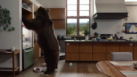 “Look who just woke up!,” comments the woman brightly. “You are so cute!,” she says to the bear, who advances to the refrigerator and noses it open, the door eventually winding up detached several feet off to the side as the bear stands upright and begins to messily forage within the fridge, physically shaking it and retrieving a bottle. Foodstuff is strewn on the beautiful hardwood flooring…