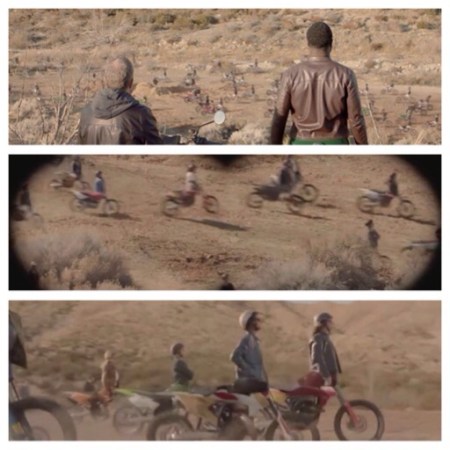 As his companion babbles about how amazing it is to see them in the wild, he is shushed by our familiar Motaur who just wishes to become lost in the moment…then we hear motor sounds of the dirt-biking Motaur herd, buzzing about like angry hornets.  They individually do wheelies, accelerate, and bound over the terrain.  Terrence Terrell then raises his front wheel in a salute to his “people.