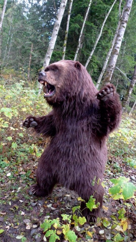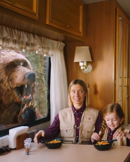The woman, her husband, and daughter all have painfully forced smiles on, which is understandable since this bear, a grizzly kodiak, is literally rocking the camper while he bellows throaty growls.  “Rough start to your family vacation?,” voices the announcer, “That’s an InnovAsian occasion!”  While only a quarter of a minute long, the commercial is a finely-tuned gem, and the bear is an animatronic marvel, stunningly realistic.