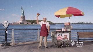 Well, this certainly is a unique business, alrighty…one which in the Liberty Mutual commercial sells wet teddy bears. It’s modeled on the cart hotdog vendor stands which you undoubtedly have seen almost everywhere, only this one isn’t selling hotdogs but rather, yep, wet teddy bears!