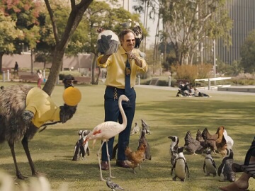 When Liberty Mutual’s “Doug” in a recent commercial starts to ply a fellow park-goer about insurance, his avian partner the emu has wandered off. This prompts Doug to resort to a key ring of bird calls, although he can’t determine which one is an emu call. Doesn’t everyone carry a key ring of bird calls?! Blowing many, Doug summons a variety of diverse birds, including raptors, a flamingo, and even penguins!