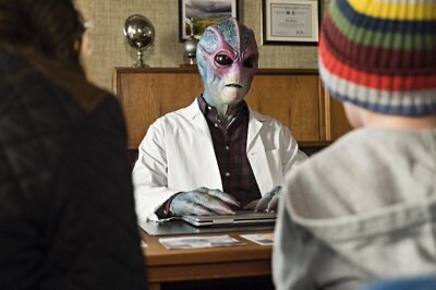 Based on a Dark Horse comic and set in the town of Patience, Colorado our alien masks his natural reptilian-type appearance with some kind of molecular projection. He has assumed the appearance, identity, and possessions of the first human he encountered, an unfortunate doctor whose body now reposes in the freezer. A scientist on his own world, our alien’s original mission was to sow a destructive device intended to exterminate humanity. An atmospheric storm caused his vessel to crash-land on our planet, however, so the parameters of his mission have been altered…