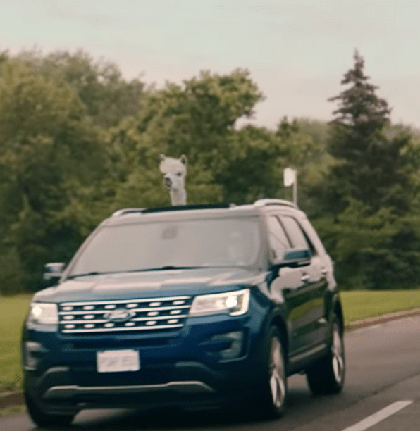 The next morning, the vehicle is delivered to the astonished farmer, neatly tied up with a bow! In the closing scene, we see the new wheels out on the road, the alpaca getting a commanding view with his long neck and head extended out of the sunroof! This alpaca (whose name is Randy) is like the closing theme tells us, “Bad to the bone!”