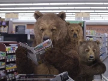 These bears calmly prowl the aisles of a supermarket on their hind legs, sniffing at cantaloupes and filling their shopping carts with generous amounts of honey, appropriately in those little bear-shaped clear containers. A bear family stops at the fish counter where they’re waited on by one of their own; there’s even a disabled bear who whizzes by in a motorized shopping cart! The cashier is likewise a bruin, calling for a price check on a honey container that stubbornly refuses to scan while the customer moans his annoyance.