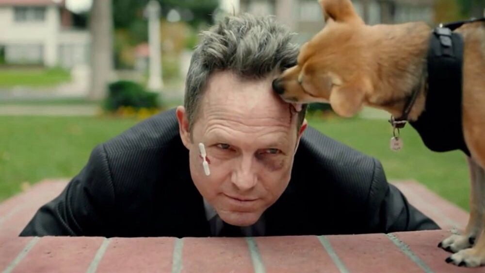 Dean Winter is back as Mayhem for Allstate Insurance as the “overly confident dog walker” who would walk 100 dogs “if his paws were big enough to hold all the leashes.” Well, he does have quite a herd of dogs leading him, and all that fur makes it hard for him to see where he’s going, causing him to take quite a header on a loose brick, his face impacting with a sickening thud on unyielding brickwork. The homeowner viewing the accident via camera comments that Mayhem is not Kevin, his usual dog walker…Mayhem responds that he is today. Our man of infinite sorrows adds that unless the homeowner has Allstate Insurance, paying for his medical bills is gonna be “ruff.” A dog sweetly licks Mayhem’s battered face…