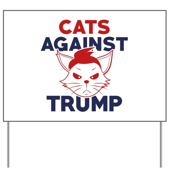 Talk about an awkward conversation!  It was equally uncomfortable when I talked to my cats about firearms.  Anyways, soon my cats were erecting lawn signs, and had discovered a wealth of resources in the Cats Against Trump merchandising line available on Amazon and other locations…