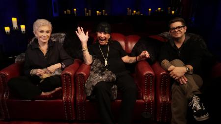 The Osbournes Want To Believe is a strange combination of reality and paranormal shows airing on the Travel Channel. Why is it on the Travel Channel?- – Who knows?! Why is wrestling on the SyFy channel? The series does “travel” in the sense of airing paranormal film clips filmed in different locations, I suppose. Each episode is filmed with three members of “The First Family of Darkness” sitting on comfy oversized red chairs in a rather gothic-styled room, complete with black accents and lots of candles burning. Patriarch Ozzy is there, complete with wife Sharon and son Jack. There’s also a Pomeranian dog or two resting on one of them or a chair armrest, and moving so little that you wonder if they’re alive. Ozzie wears a black knit hat decorated with skulls, often looks on the verge of falling asleep, and occasionally chugs large mugs of coffee to perk up a bit, requiring bathroom breaks. His speech is often accompanied with subtitles as he can be, well, difficult to understand. Sharon and Jack are readily understandable, and seem like sharp people who could pass in regular company. Ozzie may have seen better days.